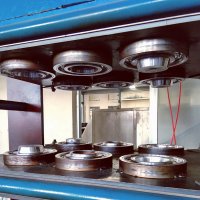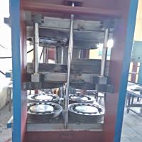 本机为小型实心轮胎生产厂家定制,专业生产小型胶轮,也适用于压制各种模压制品,如压制橡胶及热固性塑料,也适用于一薄片制品,平板硫化机为框式整体结构,压制型式为下(向下)压式,分主机、油箱和电控箱三分部。主机装有柱塞、油缸、固定平板、活动平板等部件。油箱有油泵、管道、阀等部件。油泵有电动机带动,电控箱装有按钮开关、磁力起动器、计时报警器、自动控温仪、过载保护器等,当电动机过载能自动切断电源,电加热由自动控温仪分两路控温,能在20-200℃范围内任意调节,当达到温度后,电路能自动保持恒温,达到设定的硫化时间后,能自动报警。