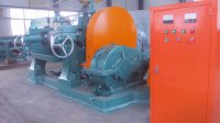 18寸开放式混炼机: 本机为双辊筒开放式炼胶机,主要有机座、机架、辊筒、传动齿轮、润滑装置、加热冷却装置、辊距调节装置、安全制动装置及电动机、减速器等组成。其辊筒采用安全冷硬铸铁制成,其表面经过磨制而形成光滑的表面。辊筒内部为空心,可以根据使用要求,通入蒸汽或冷却水,用来调节辊筒的温度。两个辊筒以不同的速度作相对回转,使胶料拉入两辊缝中受机械加工。