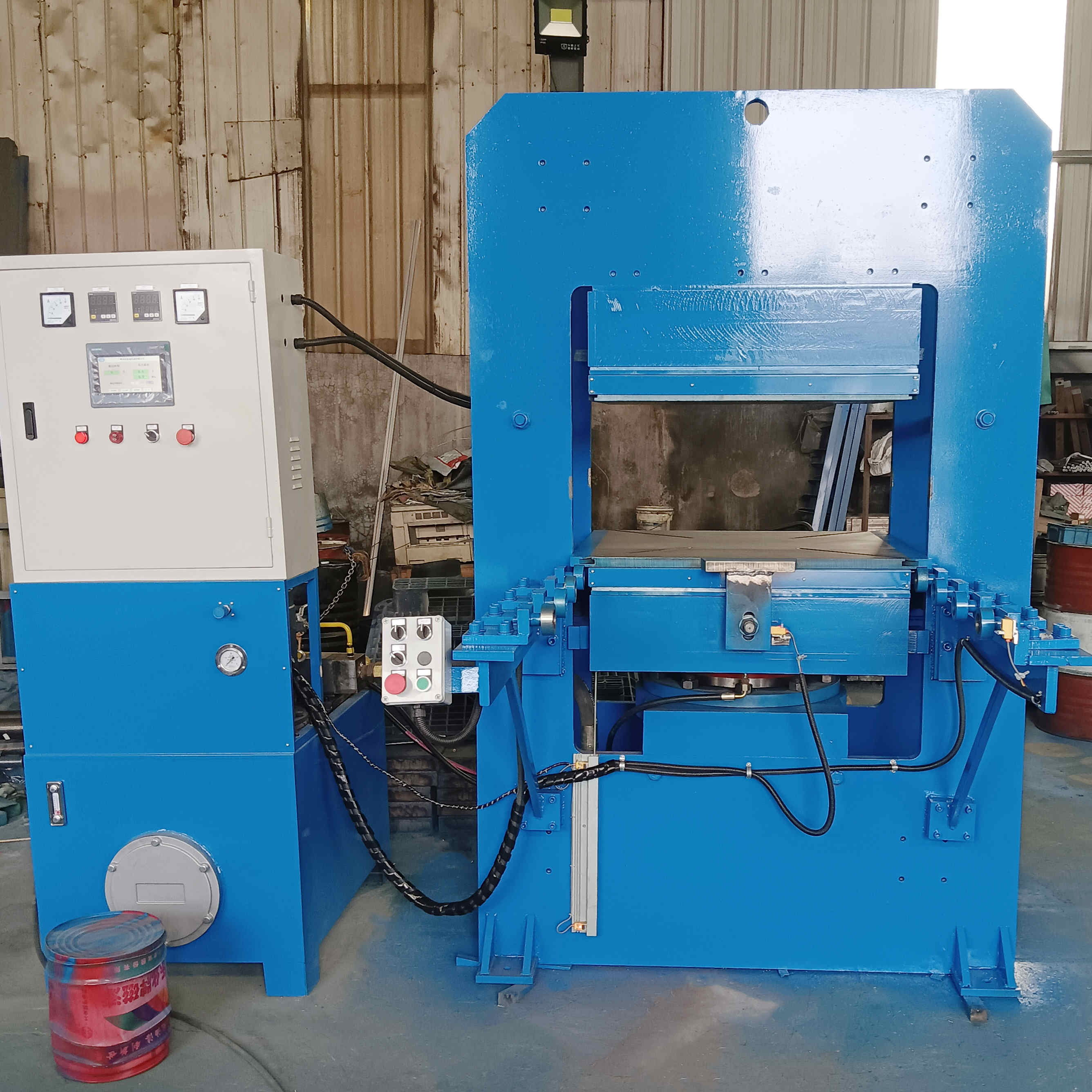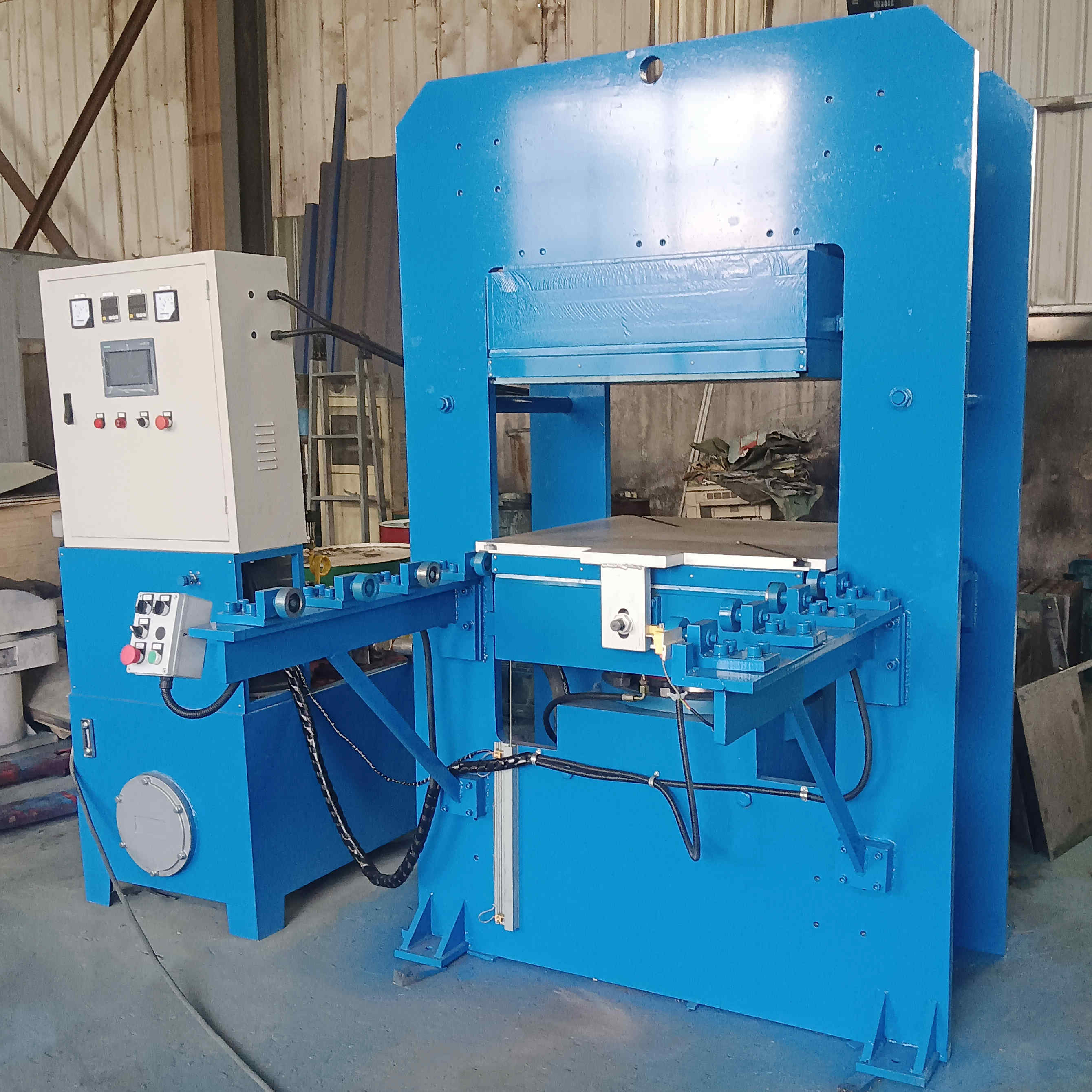 全自动生产流程: 标配 PLC 控制系统,可设定多段排气次数、硫化时间、压力范围。从模具拉入、合模打压、自动排气、硫化计时到开模推出,一键操作,降低人工成本。